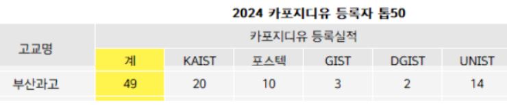* 부산과고 2024 국내 4년제 대학 진학자 96명 가운데 49명이 5개 이공계특성화대학에 진학하여 51% 수준의 진학률을 보입니다. 부산과고 2024 서울대 등록자가 8명인 점을 감안하면 6개 대학 이외 대학 진학자 비율이 41% 이상으로 여타 과고에 비해 상대적으로 높은 편임을 알 수 있습니다. 이들이 의약계열 진학자가 아니기를 바랍니다.