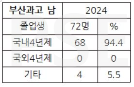 * 부산과고 2024 남학생 졸업자 72명 가운데 해외 대학 진학자는 없고, 68명이 국내 4년제 대학에 진학하여 94% 이상의 진학률을 보입니다.