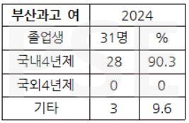 * 부산과고 2024 여학생 졸업자 31명 가운데 해외 대학 진학자는 없는 28명이 국내 4년제 대학에 진학하여 90% 이상의 진학률을 보입니다. 부산과고는 남녀 학생 모두 높은 진학률을 보입니다.