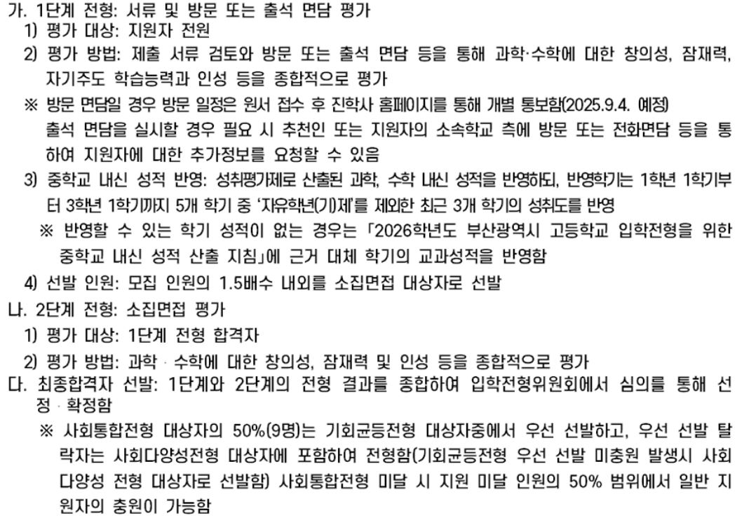 * 부산일과고 또한 여느 과고와 유사한 "불이익" 타령에 '동의하는 경우에만 지원 가능'을 반복하고 있습니다. 한국 과학고들은 왜 이렇게 하나같이 수동적인 모습을 보이는지 모르겠습니다. 그나마 학생은 물론 학부모의 동의서라도 요구하는 소수 학교를 제외하고, 대다수 과학고는 이런 안이한 정책을 정책이라고 내세우고 있습니다. 의도적이라고 의심됩니다. 사실 학생들은 동의했으므로 입학은 강행하고 장학금, 진학 상담 등 과고의 "기타" 서비스는 안 받겠다고 우기면 그만일 듯합니다.
