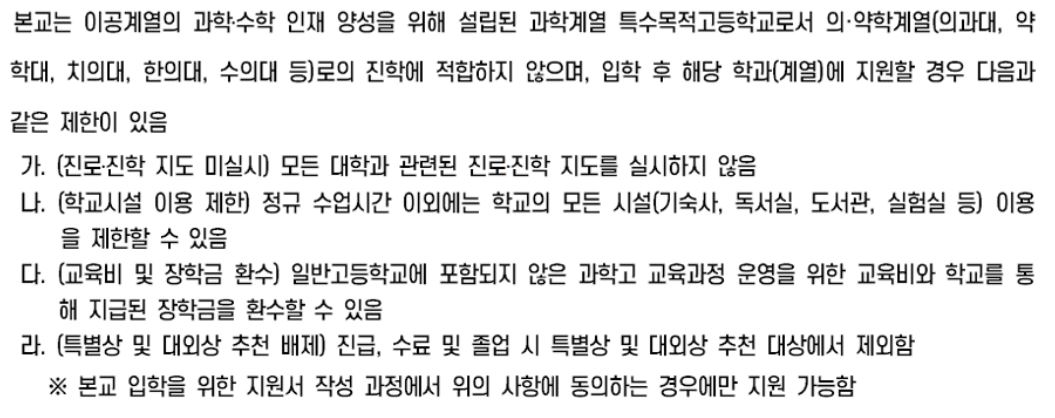 * 부산일과고 또한 여느 과고와 유사한 "불이익" 타령에 '동의하는 경우에만 지원 가능'을 반복하고 있습니다. 한국 과학고들은 왜 이렇게 하나같이 수동적인 모습을 보이는지 모르겠습니다. 그나마 학생은 물론 학부모의 동의서라도 요구하는 소수 학교를 제외하고, 대다수 과학고는 이런 안이한 정책을 정책이라고 내세우고 있습니다. 의도적이라고 의심됩니다. 사실 학생들은 동의했으므로 입학은 강행하고 장학금, 진학 상담 등 과고의 "기타" 서비스는 안 받겠다고 우기면 그만일 듯합니다.