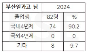 * 부산일과고 2024 남학생 졸업자 82명 가운데 해외 대학 진학자는 없고 8명을 제외한 74명이 국내 4년제 대학에 진학하여 90% 이상의 높은 진학률을 보입니다.