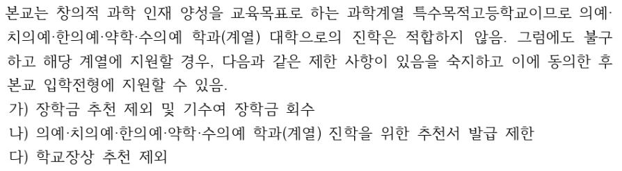 * 경남과고는 여타 과고의 "불이익" 타령은 없지만, "제한사항을 숙지하고 동의한 후 지원했다"를 요구하는 수준입니다. 즉, '오는 걸 막지 않고, 가는 건 지원하지 않는다' 정책을 공시하고 있는데, 한국 과학고들은 왜 이렇게 하나같이 수동적인 모습을 보이는지 모르겠습니다. 의약대를 원하는데 왜 과고를 간단 말입니까? 설립된 특수 목적에 위배되는데 왜 이런 학생을 입학 허가해야 합니까? '진로 선택의 자유' 따위로 덮을 생각이라고 보는데, 안이하고 사실 세금 낭비에 무책임하게 느껴집니다.