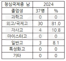 * 청심국제중 2024 남학생 졸업자 37명 가운데 과고, 마이스터고, 특성화고 및 기타 진학 상황은 없고, 30명(81%)이 외고 및 국제고를 진학하여 국제중의 특성을 매우 강하게 드러내고 있는 점은 주목할 필요가 있습니다. 자사고 진학자는 4명, 일반고 진학자는 3명입니다.
