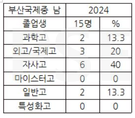 * 부산국제중 2024 남학생 졸업자 15명 가운데 기타( 외국인학교, 특수학교, 각종학교, 영재학교, 학력 인정 국외교육기관 등) 진학자 1명, 미상 1명임을 감안해서 참고하세요.