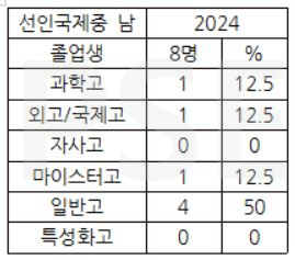 * 선인국제중 2024 남학생 졸업자 8명 가운데 일반고 진학자 4명(50%), 마이스터고 진학자 1명, 외고 및 국제고 진학자 1명 및 과고 진학자는 1명입니다. 이외 대안학교 진학자가 1명 존재합니다.