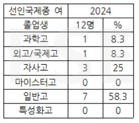 * 선인국제중 2024 여학생 졸업자 12명 가운데 특성화고와 마이스터고 진학자는 없습니다. 과고 진학자 1명, 외고 및 국제고 진학자 1명, 자사고 진학자 3명 및 일반고 진학자 7명(58.3%)의 진학 성과를 보입니다. 적은 수의 학생인데 과고 진학자가 남녀 각 1명씩이나 되는 점은 눈길을 끕니다. 또한 국제중인데 외고 및 국제고 진학자는 남녀 각 1명으로 많지 않은 점도 유의할 만합니다.