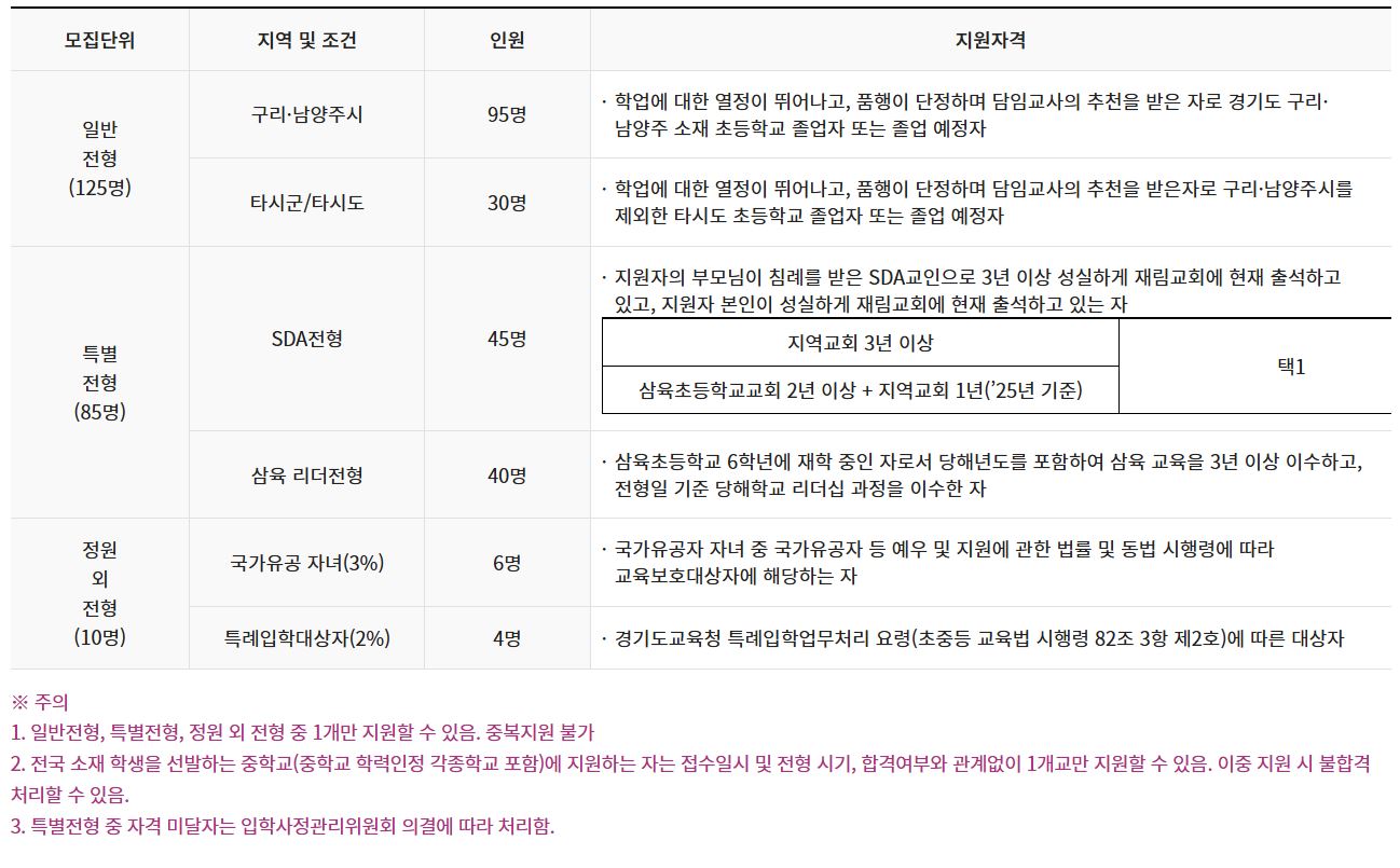 2. 서울삼육중 신입생 모집 인원 및 지원 자격