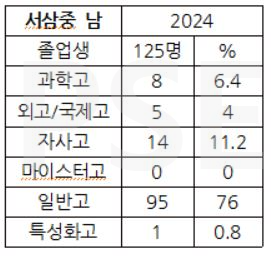 * 서삼중 2024 남학생 졸업자 125명 가운데 자사고 진학자는 14명(11.2%), 외고 및 국제고 진학자는 5명(4%), 과고 진학자는 8명(6.4%)입니다. 남학생의 경우 기타( 외국인학교, 특수학교, 각종학교, 영재학교, 학력 인정 국외교육기관 등) 진학자가 2명 존재합니다.