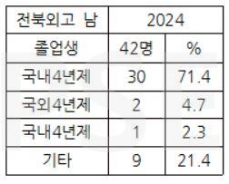 * 전북외고 2024 남학생 졸업자 42명 가운데 해외 4년제 대학 진학자는 2명(4.7%), 국내 4년제 대학 진학자는 30명(71.4%)으로 상당히 높은 진학률을 보입니다. 전문대 진학자도 1명(2.3%) 있고, 졸업생의 21% 이상이 재수를 하는 상황입니다.