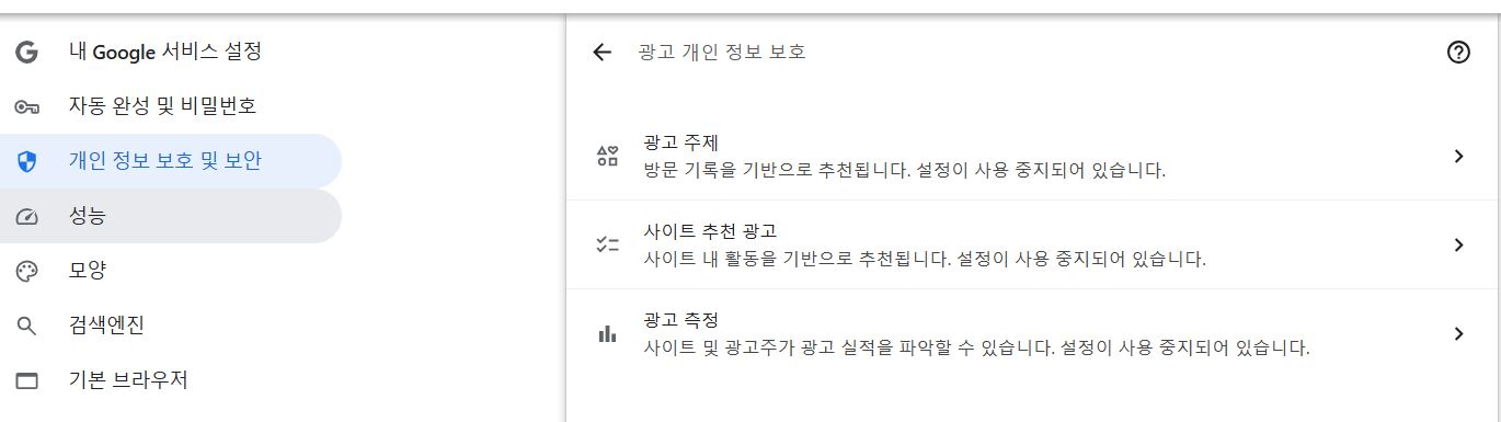 * 광고 개인정보 보호 클릭 > 이렇게 아래처럼 메뉴 나옵니다. 세 개 모두 중지하세요.