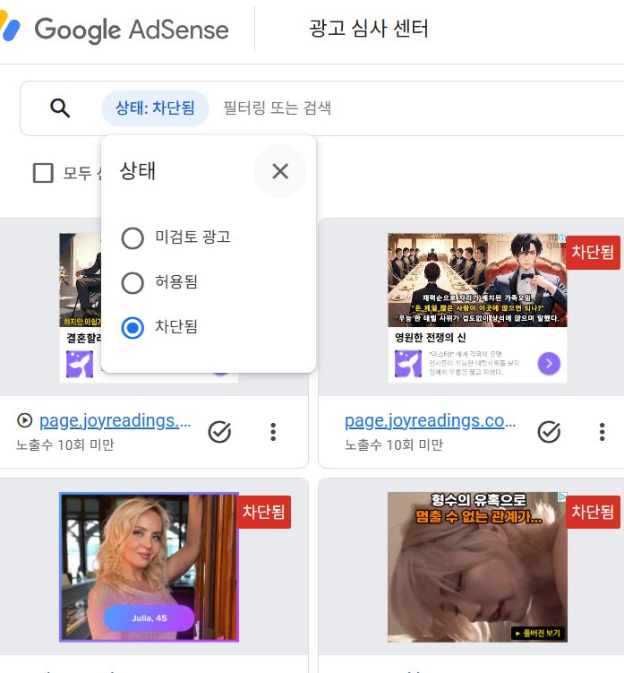 확인 사살합니다. 광고심사센터 다시 클릭 > 상태 클릭 > 차단됨 클릭