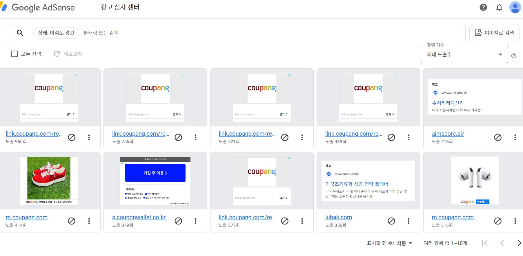 * 광고심사센터 클릭> 이렇게 광고 중인 애들이 뜹니다. 필터 검색 다 해봤지만 효과 없습니다. 그냥 점심 드시고 나른할 때 오른쪽 최하단 화살표 클릭하면서 스스로 검토하세요. 저는 오늘 1000개 검색해서 8마리 잡았습니다. ㅆ 구글 것들이 일부터 필터링 후지게 만들어 놓은 듯합니다.
