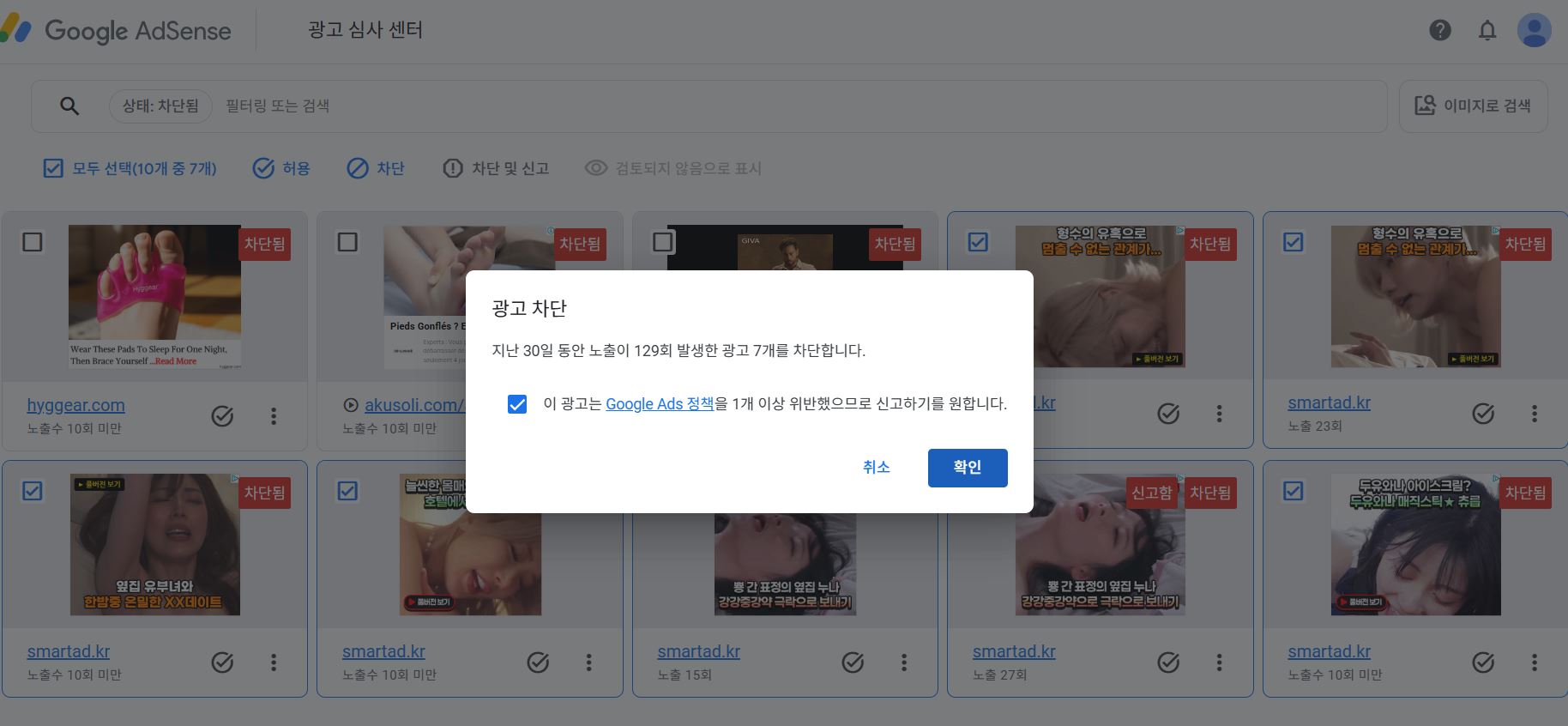* 그럼 그 광고주의 벌레 광고들이 모조리 뜹니다. 아래의 예시처럼 말입니다. 그럼 모두 선택해서 차단 및 신고!
