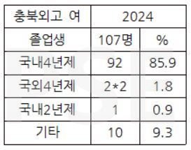 * 충북외고 2024 여학생 졸업자 107명 가운데 국외 4년제 대학 진학자 2명, 국외 2년제 대학 진학자 2명, 국내 4년제 대학 진학자 92명(85.9%)으로 매우 높은 진학률을 보이는 점을 유의할 필요가 있습니다. 국내 전문대 진학자 1명을 제외한 10명(9.3%)이 재수를 선택한 상황입니다.