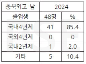 * 충북외고 2024 남학생 졸업자 48명 가운데 해외 대학 진학자는 없고 국내 4년제 대학 진학자는 41명으로 85.4%의 매우 높은 진학률을 보여줍니다. 전문대 진학자 1명, 취업자 1명 이외에 10% 이상의 남학생 졸업자가 재수를 선택하는 상황입니다.