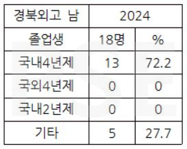 * 경북외고 2024 남학생 졸업자 18명 가운데 해외 대학이나 전문대 진학자는 없고 13명이 국내 4년제 대학에 진학하여 72.2%의 진학률을 보입니다.