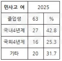 * 민사고 2025 여학생 졸업자 63명 가운데 국내 4년제 대학 진학자는 27명(42.8%), 국외 4년제 대학 진학자는 16명(25.3%), 재수생은 20명(31.7%)의 진학 상황을 보입니다. 여학생의 경우 국내 대학 진학 비율이 더 높은 점이 눈길을 끕니다.