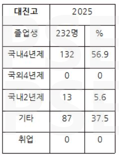 * 대진고 2025 졸업생 232명 가운데 해외 대학 진학자는 없고, 132명이 국내 4년제 대학에 진학하여 56.9%의 진학률을 보입니다. 여타 일반고 남학생의 진학률에 비해 상대적으로 높은 진학률인 점을 주목할 만합니다. 13명(5.6%)이 전문대에 진학하였고, 졸업생의 37% 이상이 재수를 선택한 상황입니다.