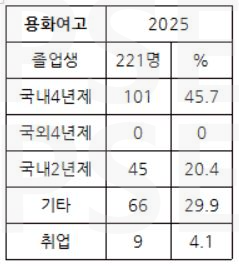 * 용화여고 2025 졸업생 221명 가운데 해외 대학 진학자는 없고, 101명이 국내 4년제 대학에 진학하여 45.7%의 진학률을 보입니다. 여타 일반 여고의 진학률에 비해 높지 않은 진학률인 점을 유의할 만합니다. 전문대 진학자는 45명(20.4%), 취업자는 9명(4.1%)으로 졸업생의 29% 이상이 재수를 선택하는 상황입니다.
