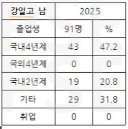 * 강일고 2025 남학생 졸업자 91명 가운데 해외 대학 진학자나 취업자는 없고, 43명이 국내 4년제 대학에 진학하여 47.2%의 진학률을 보입니다. 전문대 진학자는 19명(20.8%)으로 졸업생의 31% 이상이 재수를 하는 상황입니다.