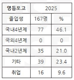 * 영등포고 2025 졸업생 167명 가운데 해외 대학 진학자는 없고 국내 4년제 대학 진학자는 77명으로 46.1%의 진학률을 보입니다. 취업자가 16명(9.6%)으로 여타 남고에 비해 많은 편이고 전문대 진학자 역시 35명(21%)으로 여타 일반 남고에 비해 상대적으로 높은 비율입니다. 덕분에 졸업생의 23% 이상이 재수를 하는 상황으로 상대적으로 매우 낮은 재수 비율을 보입니다.