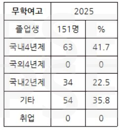 * 무학여고 2025 졸업생 151명 가운데 해외 대학 진학자는 없고 국내 4년제 대학 진학자는 63명으로 41.7%의 진학률을 보입니다. 서울시 여타 일반 여고의 진학률에 비해 상대적으로 낮은 진학률을 유의할 필요가 있습니다. 전문대 진학자는 34명(22.5%)이고 취업자는 없어 졸업생의 35% 이상이 재수를 하는 상황입니다.