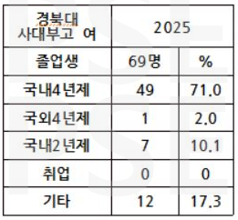 * 경북대사대부고 2025 여학생 졸업자 69명 가운데 국외 4년제 대학 진학자는 1명(2%), 국내 4년제 대학 진학자는 49명(71%)으로 73% 이상의 높은 진학률을 보입니다. 전문대 진학자 7명(10.1%)을 제외한 여학생 졸업자의 17% 이상이 재수를 선택하는 상황입니다.