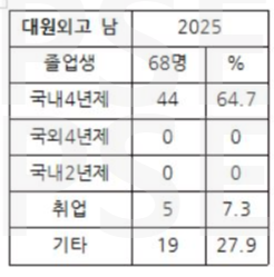 * 대원외고 2025 남학생 졸업자 68명 가운데 해외 대학 진학자는 없고, 국내 4년제 대학 진학자는 44명으로 64% 이상의 높은 진학률을 보입니다. 전문대 진학자는 없지만 취업자 5명 (7.3%)이 눈길을 끌고 졸업생의 27% 이상이 재수를 선택하는 상황입니다.