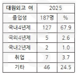 * 대원외고 2025 여학생 졸업자 187명 가운데 국외 4년제 대학 진학자는 5명(2.6%), 국내 4년제 대학 진학자는 127명(67.9%)으로 70% 이상의 높은 진학률을 보입니다. 전문대 진학자는 2명(1%), 취업자는 7명(3.7%)으로 졸업생의 24% 이상이 재수를 선택하는 상황입니다. 대원외고의 경우 취업자가 졸업생의 11%로 높은 비율을 보이는 점을 주목할 필요가 있습니다.